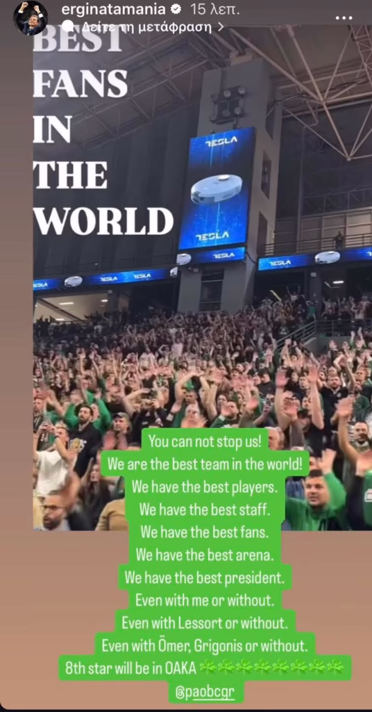 Ο Αταμάν θέλησε να συνεχίσει στον ίδιο ρυθμό και μετά τον αγώνα, αφού σε story του αποθέωσε κόσμο, παίκτες, γήπεδο, πρόεδρο και έστειλε μήνυμα για το 8ο αστέρι.