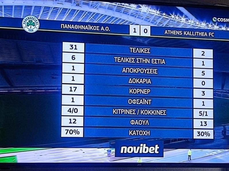 Συνολικά ο Παναθηναϊκός είχε 31 τελικές, με μόλις οι έξι όμως να είναι στον στόχο, τη στιγμή που η ομάδα της Καλλιθέας είχε δύο και μία στον στόχο. Από εκεί και πέρα, οι «πράσινοι» είχαν και ένα δοκάρι με τον Τετέ, ενώ και η κατοχή ήταν συντριπτικά υπέρ του Παναθηναϊκού με 70-30%, με μεγάλο ρόλο σε αυτό να παίζει και η κόκκινη που δέχθηκαν οι φιλοξενούμενοι στο πρώτο ημίχρονο.